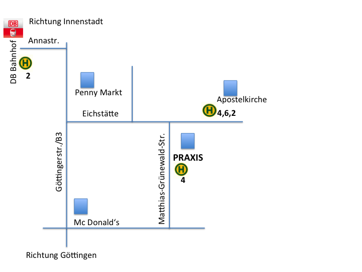 - Unsere Praxis befindet sich im Stadtteil Northeim-Süd. Von der B3 aus Göttingen kommend, biegen Sie nach dem Mc Donalds die nächste Straße rechts ab. Nach circa 200m liegt die Praxis auf der rechten Seite in einem großen Gebäude.